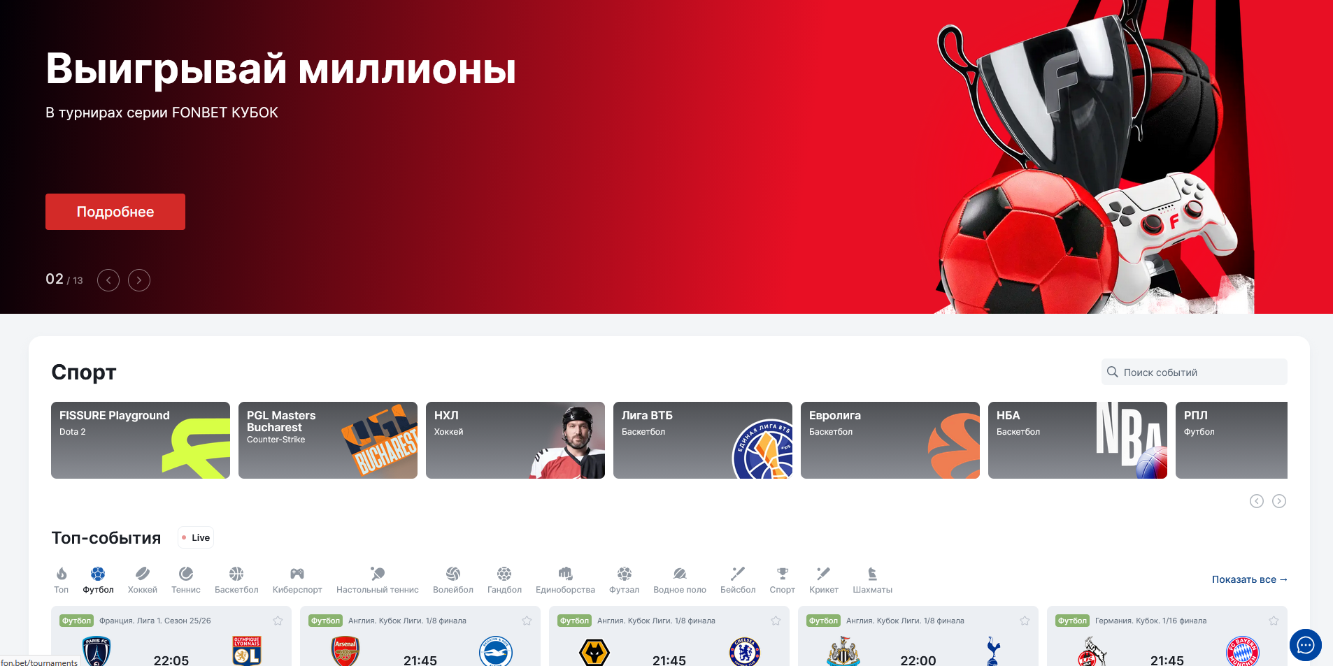 - Раздел популярных турниров - Лига Чемпионов, Премьер-лига, NBA